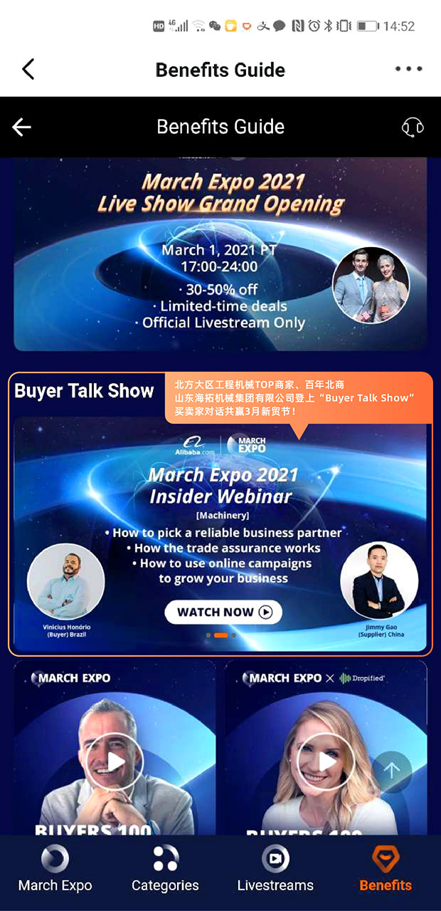 新貿節(jié)會場買家Befefits頁面直接進入,半小時對話節(jié)目海拓機械代表北方商家強勢發(fā)聲!