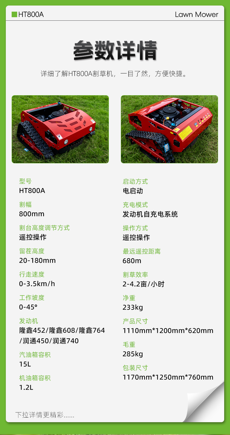 HT800A遙控割草機(jī)680m遠(yuǎn)距遙控,割草效率可達(dá)4.2畝/小時
