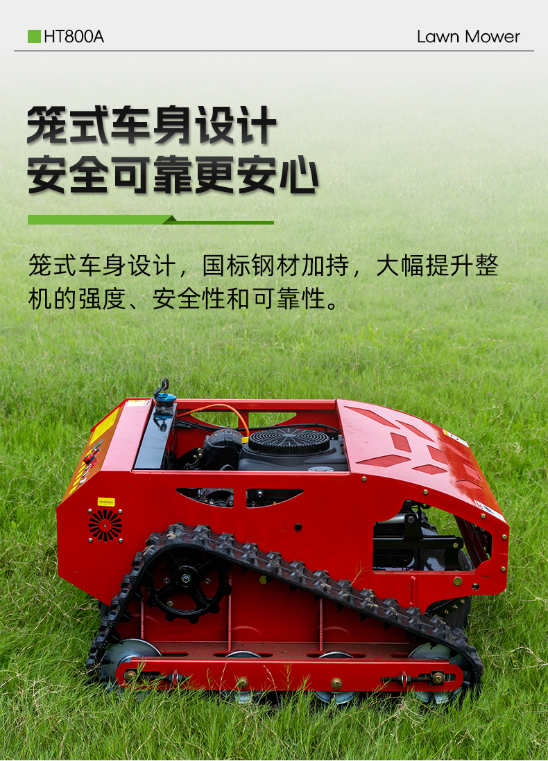 HT800A遙控割草機(jī)籠式車身設(shè)計,國標(biāo)鋼材加持,大幅提升整機(jī)的強(qiáng)度、安全性和可靠性。