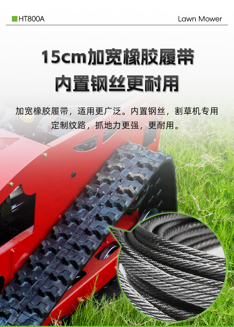 加寬橡膠履帶,適用更廣泛。內(nèi)置鋼絲,割草機(jī)專用定制紋路,抓地力更強(qiáng),更耐用。